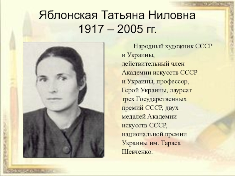 Яблонская Татьяна Ниловна  1917 – 2005 гг. 	Народный художник СССРи Украины,действительный членАкадемии искусств СССРи Украины, профессор,Герой