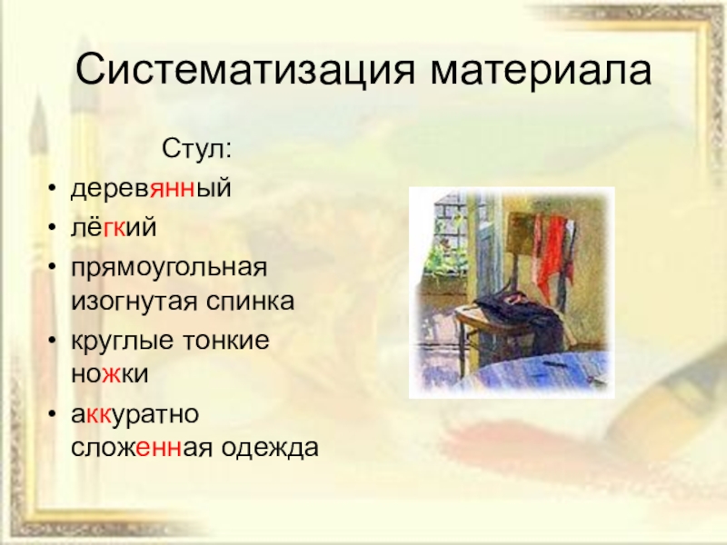 Систематизация материалаСтул:деревянныйлёгкийпрямоугольная изогнутая спинкакруглые тонкие ножкиаккуратно сложенная одежда