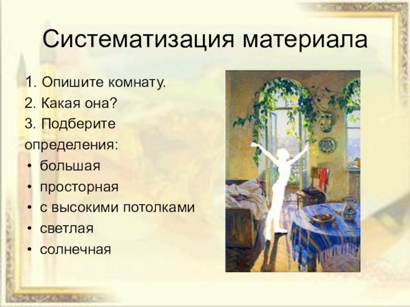 Систематизация материала1. Опишите комнату.2. Какая она?3. Подберитеопределения:большаяпросторнаяс высокими потолкамисветлаясолнечная