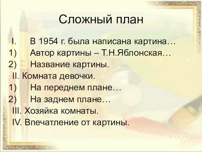 Сложный планВ 1954 г. была написана картина…Автор картины – Т.Н.Яблонская…Название картины.II. Комната девочки.На переднем плане…На заднем плане…III.