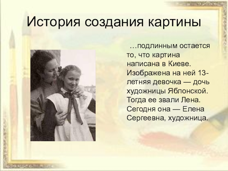 История создания картины	…подлинным остается то, что картина написана в Киеве. Изображена на ней 13-летняя девочка — дочь