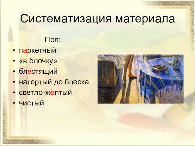 Систематизация материалаПол:паркетный«в ёлочку»блестящийнатертый до блескасветло-жёлтыйчистый