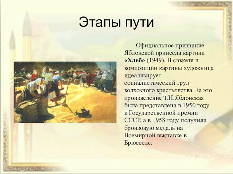 Этапы пути	Официальное признаниеЯблонской принесла картина«Хлеб» (1949). В сюжете икомпозиции картины художницаидеализируетсоциалистический трудколхозного крестьянства. За этопроизведение Т.Н.Яблонскаябыла представлена
