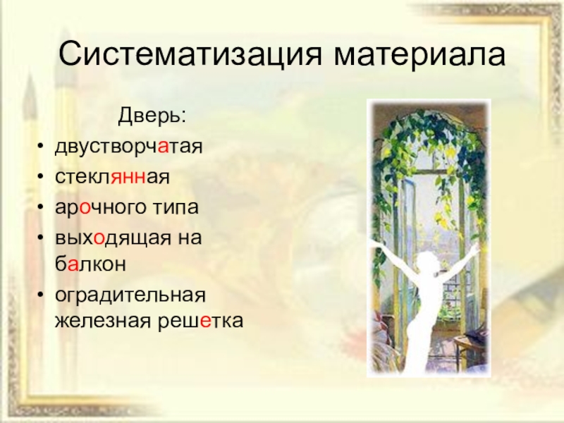 Систематизация материалаДверь:двустворчатаястекляннаяарочного типавыходящая на балконоградительная железная решетка