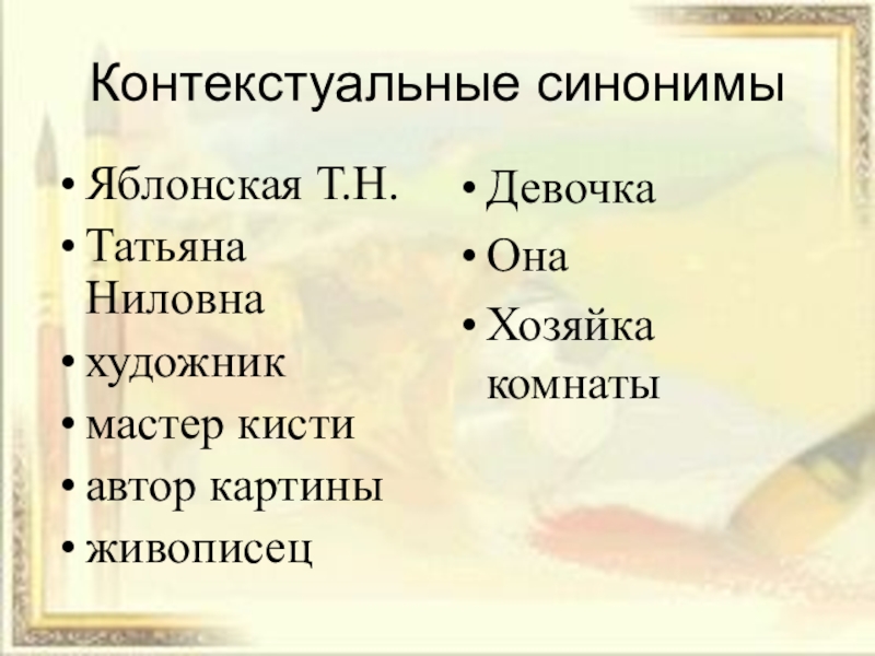 Контекстуальные синонимыЯблонская Т.Н.Татьяна Ниловнахудожникмастер кистиавтор картиныживописецДевочка ОнаХозяйка комнаты