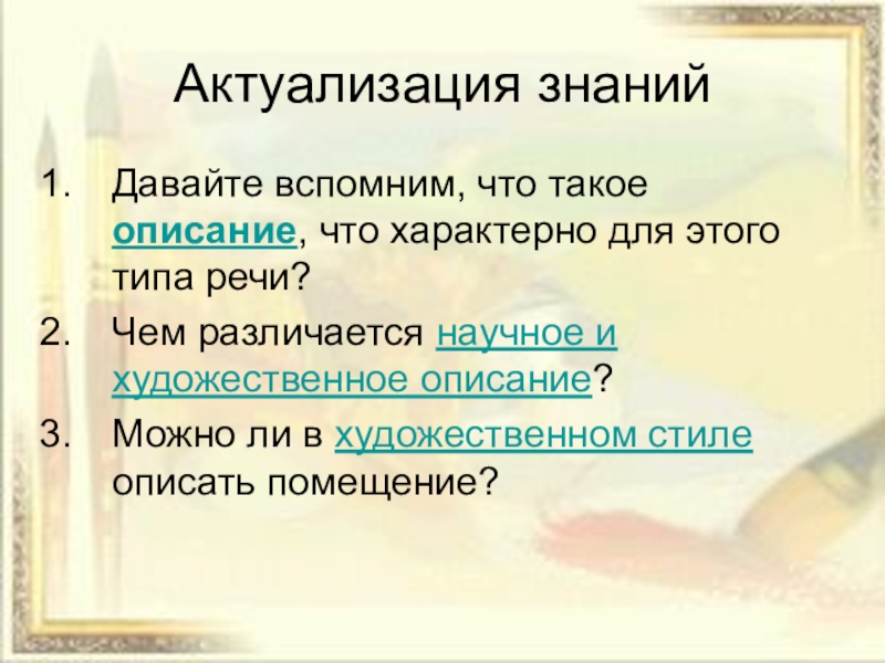 Актуализация знанийДавайте вспомним, что такое описание, что характерно для этого типа речи?Чем различается научное и художественное описание?Можно ли в художественном стиле описать помещение?