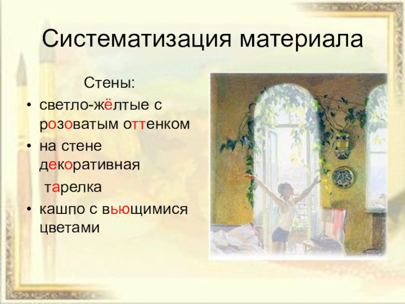 Систематизация материалаСтены:светло-жёлтые с розоватым оттенкомна стене декоративная	тарелкакашпо с вьющимися цветами