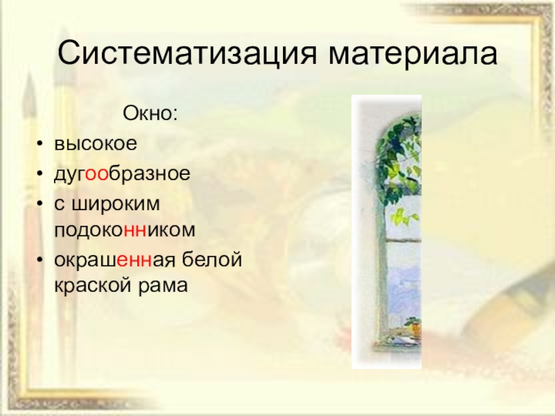 Систематизация материалаОкно:высокоедугообразноес широким подоконникомокрашенная белой краской рама