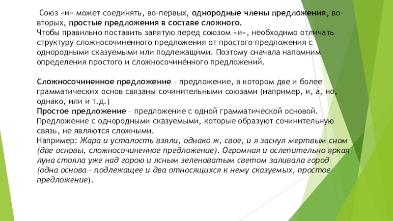 Слайд 2 Союз «и» может соединять, во-первых, однородные члены предложения, во-вторых, простые