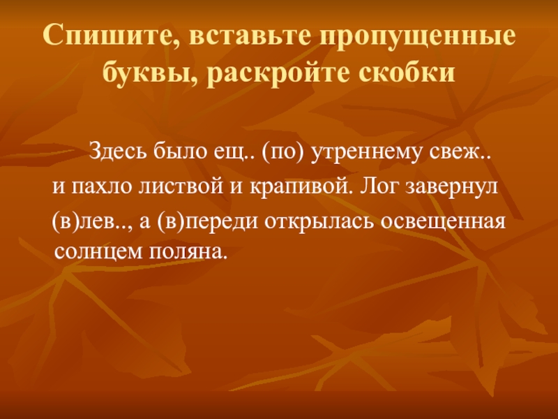 Слайд 19Спишите, вставьте пропущенные буквы, раскройте скобки
