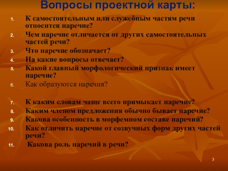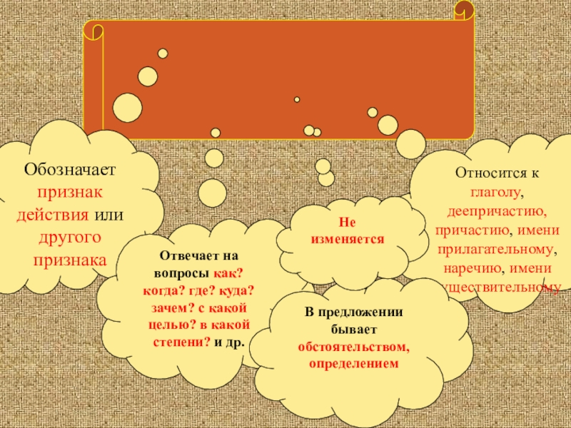Отвечает на вопросы как? когда? где? куда? зачем? с какой целью? в какой степени? и др.