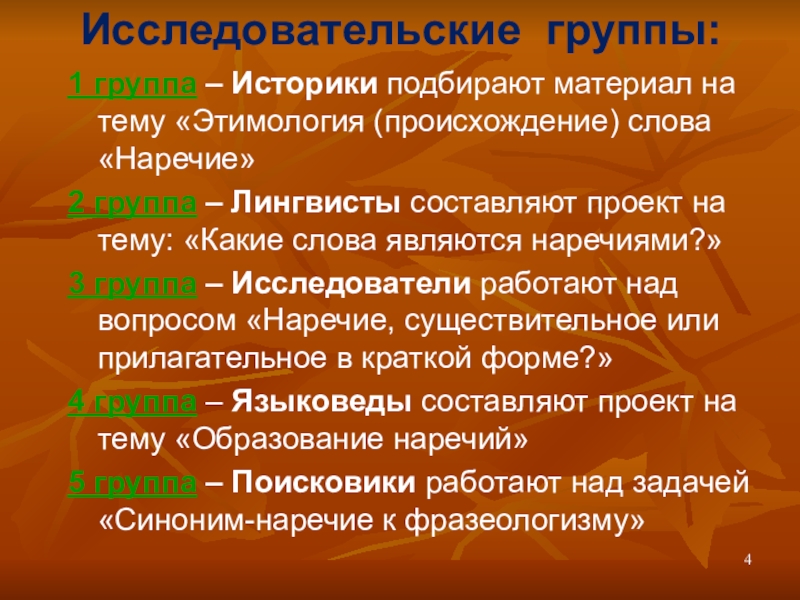 4 группа – Языковеды составляют проект на тему «Образование наречий»