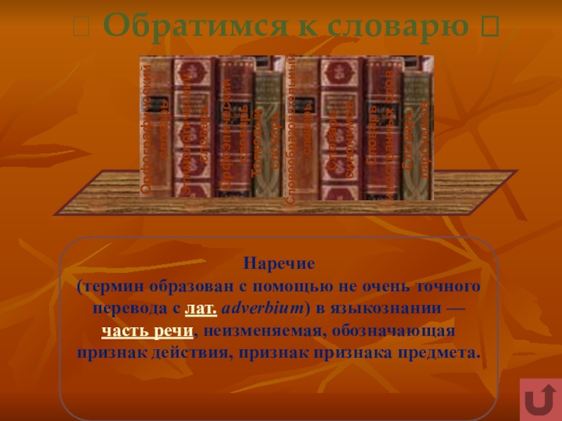 точного перевода с лат. adverbium) в языкознании — часть речи, неизменяемая, обозначающая признак действия, признак признака предмета.