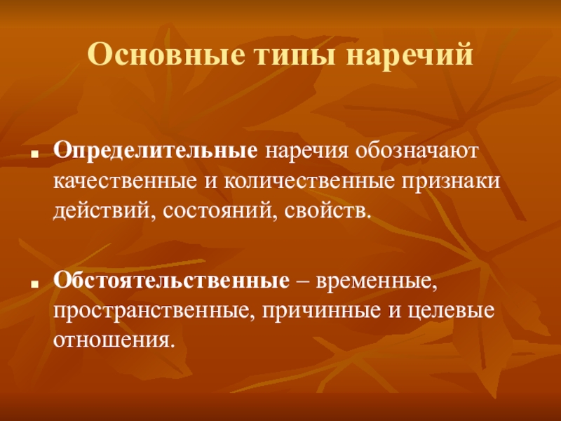 Обстоятельственные – временные, пространственные, причинные и целевые отношения.