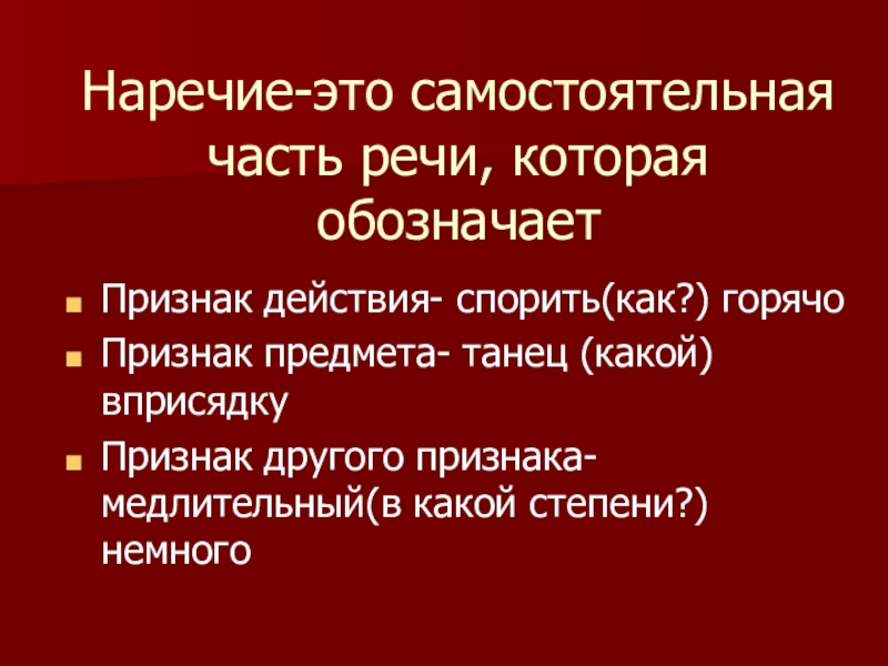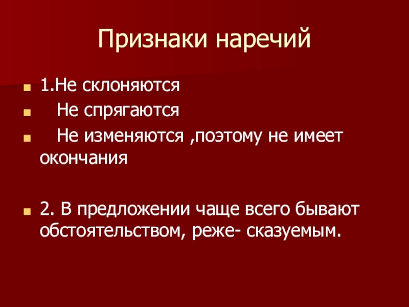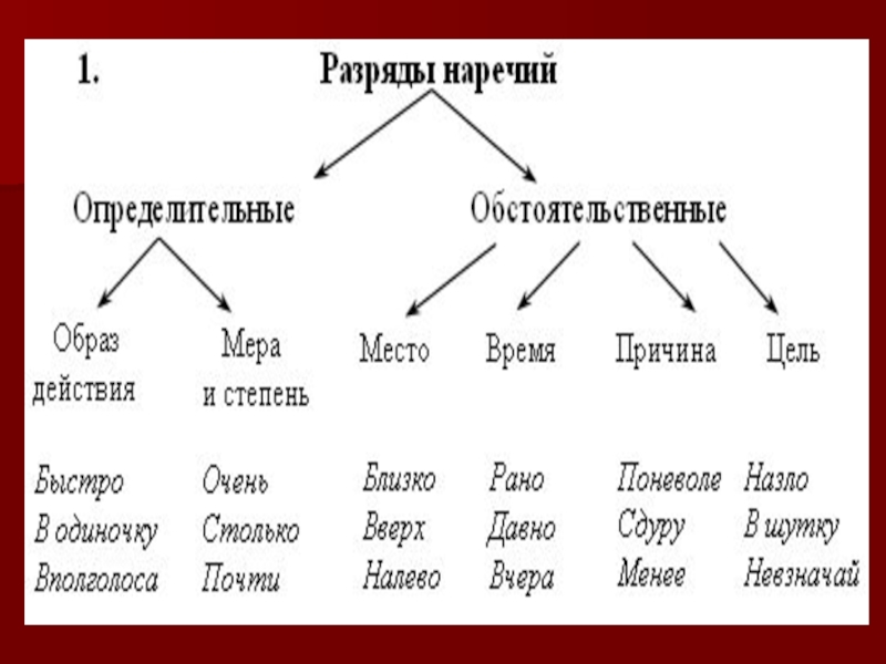 с грамматическими, морфологическими признаками и его синтаксической ролью; учить находить наречия в предложениях;