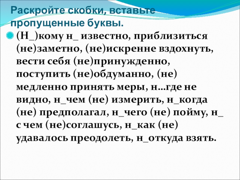 вести себя (не)принужденно, поступить (не)обдуманно, (не)медленно принять меры, н…где не видно, н_чем (не) измерить, н_когда (не) предполагал, н_чего (не) пойму, н_ с чем (не)соглашусь, н_как (не)удавалось преодолеть, н_откуда взять.
