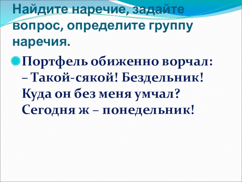 Слайд 18Найдите наречие, задайте вопрос, определите группу наречия.