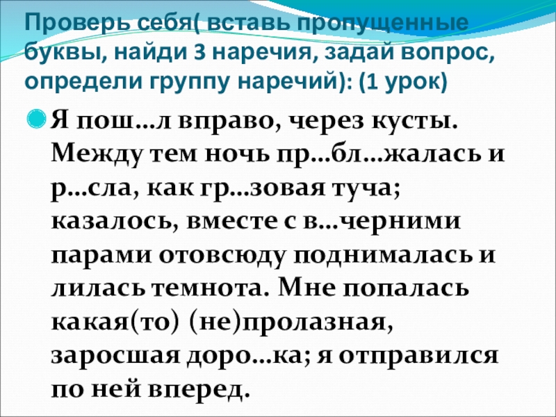Проверь себя( вставь пропущенные буквы, найди 3 наречия, задай вопрос, определи группу наречий): (4 урок)
