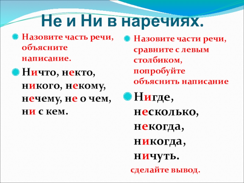 Ознакомьтесь с двумя группами отрицательных наречий и составьте с каждым