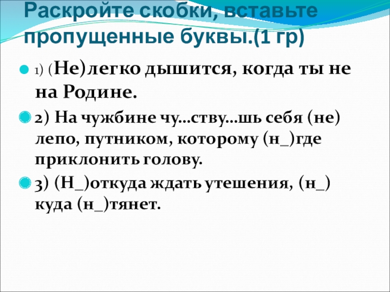 2) На чужбине чу…ству…шь себя (не)лепо, путником, которому (н_)где приклонить голову.