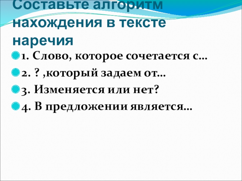 Слайд 12Составьте алгоритм нахождения в тексте наречия