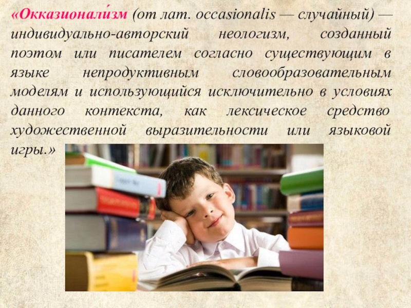 Слайд 20«Окказионали́зм (от лат. occasionalis — случайный) — индивидуально-авторский неологизм, созданный поэтом