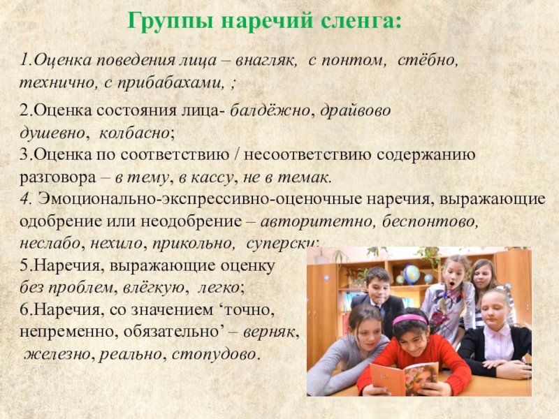 4. Эмоционально-экспрессивно-оценочные наречия, выражающие одобрение или неодобрение – авторитетно, беспонтово, неслабо, нехило, прикольно, суперски;