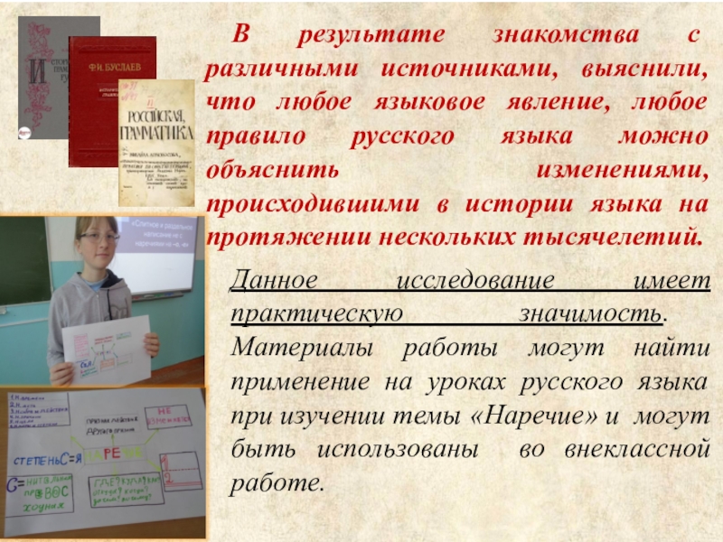 Данное исследование имеет практическую значимость. Материалы работы могут найти применение на уроках русского языка при изучении темы «Наречие» и могут быть использованы во внеклассной работе.