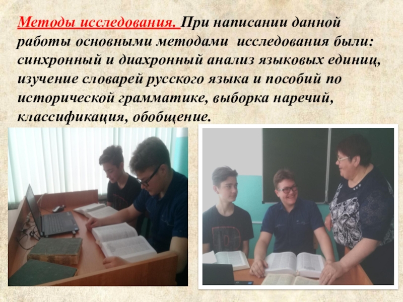 и диахронный анализ языковых единиц, изучение словарей русского языка и пособий по исторической грамматике, выборка наречий, классификация, обобщение.