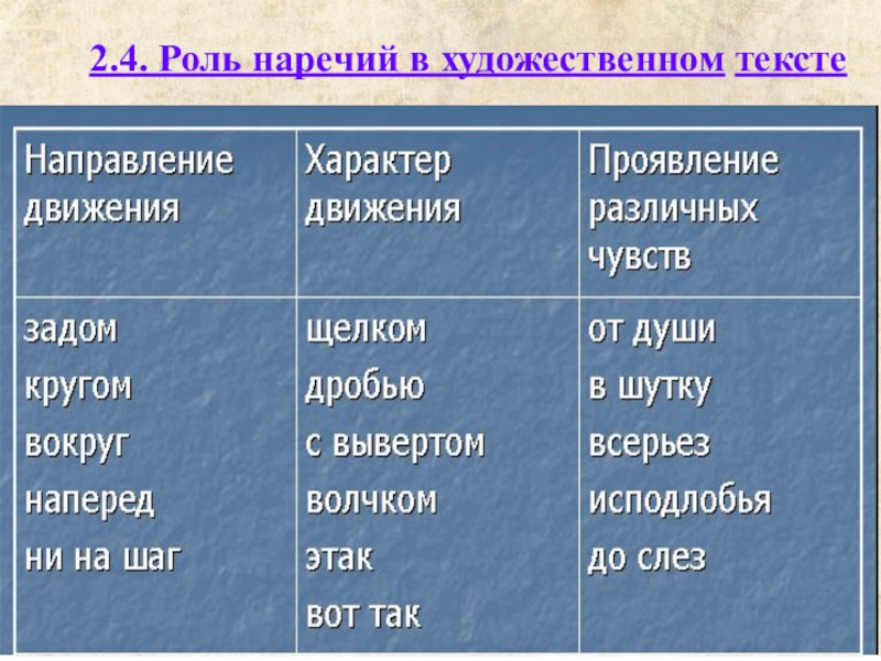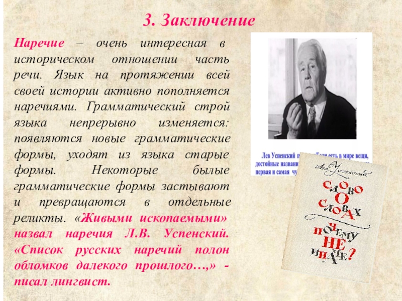 на протяжении всей своей истории активно пополняется наречиями. Грамматический строй языка непрерывно изменяется: появляются новые грамматические формы, уходят из языка старые формы. Некоторые былые грамматические формы застывают и превращаются в отдельные реликты. «Живыми ископаемыми» назвал наречия Л.В. Успенский. «Список русских наречий полон обломков далекого прошлого…,» - писал лингвист.