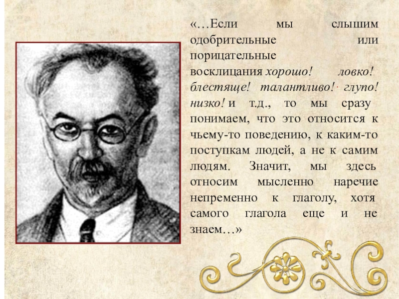 низко! и т.д., то мы сразу понимаем, что это относится к чьему-то поведению, к каким-то поступкам людей, а не к самим людям. Значит, мы здесь относим мысленно наречие непременно к глаголу, хотя самого глагола еще и не знаем…»