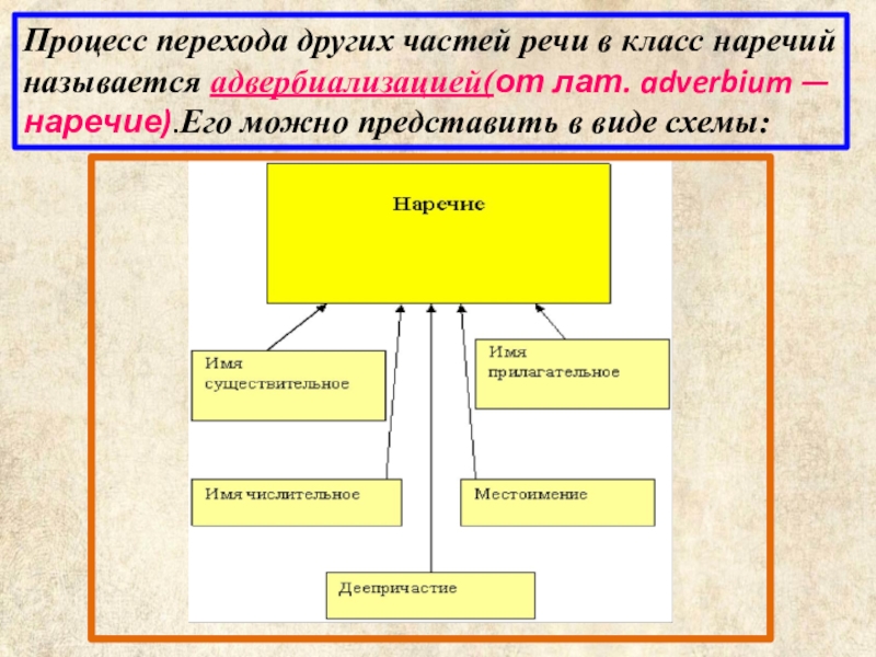 Слайд 10Процесс перехода других частей речи в класс наречий называется адвербиализацией(от лат.