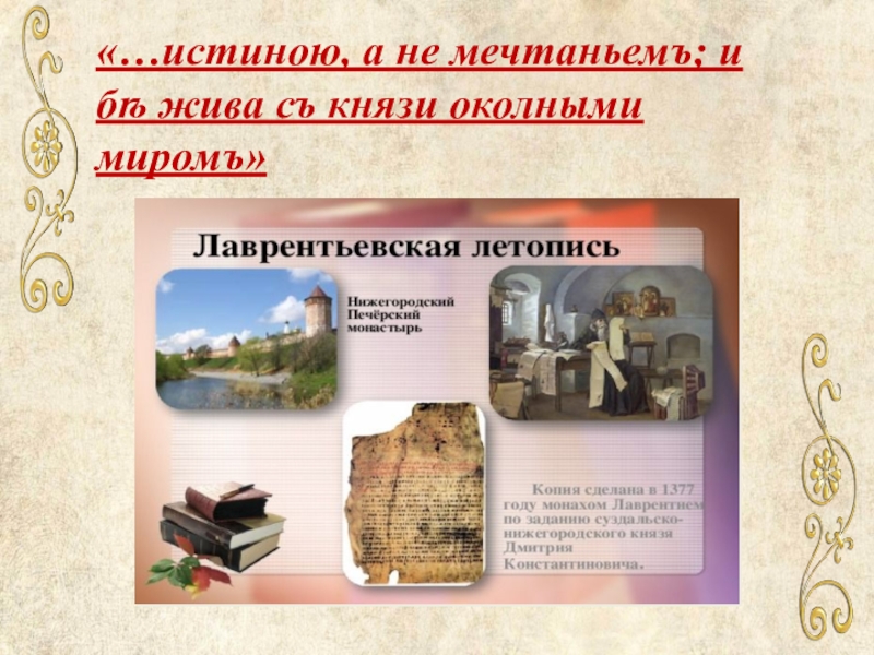 Слайд 11«…истиною, а не мечтаньемъ; и бѣ жива съ князи околными миромъ»