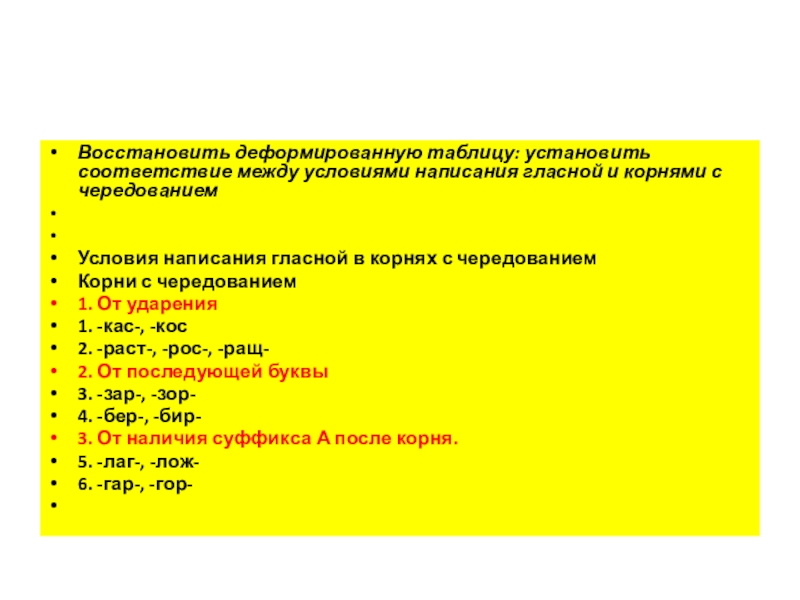 Слайд 17Восстановить деформированную таблицу: установить соответствие между условиями написания гласной и корнями