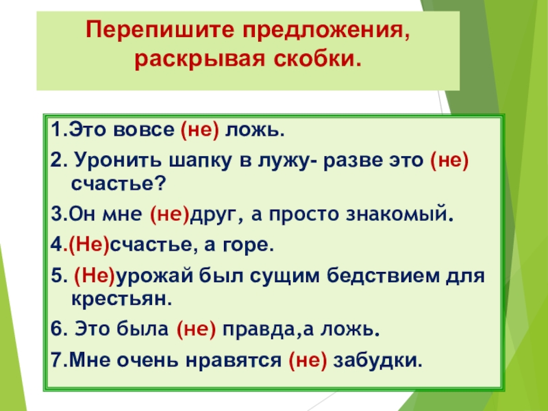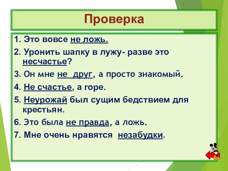 Проверка1. Это вовсе не ложь.2. Уронить шапку в лужу- разве это несчастье?3. Он мне не друг, а