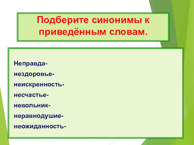 Проверка Неправда- ложь, обман нездоровье- болезнь, хворь неискренность-лицемерие несчастье- горе, беда невольник- заключённый,узник неравнодушие-заинтересованность неожиданность-внезапность