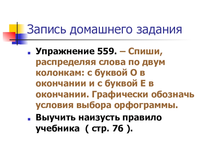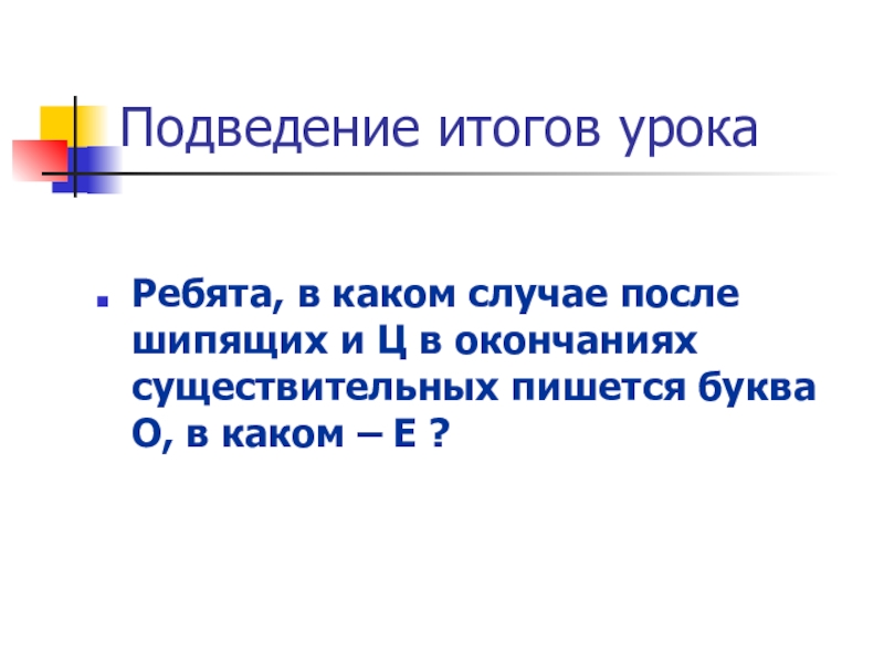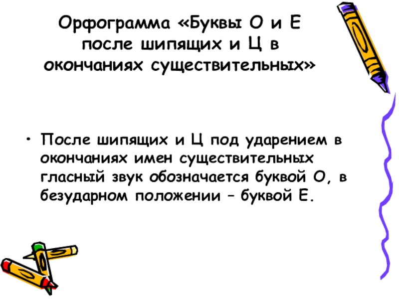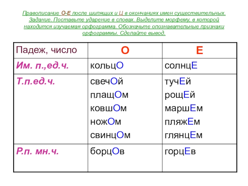 После шипящих и Ц под ударением в окончаниях имен существительных гласный звук обозначается буквой О, в безударном положении – буквой Е.