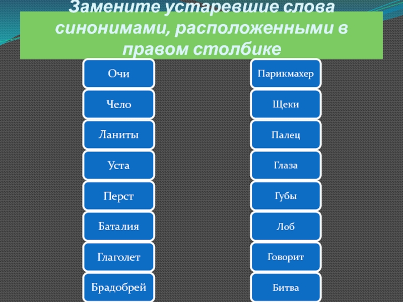 Слайд 7Замените устаревшие слова синонимами, расположенными в правом столбике