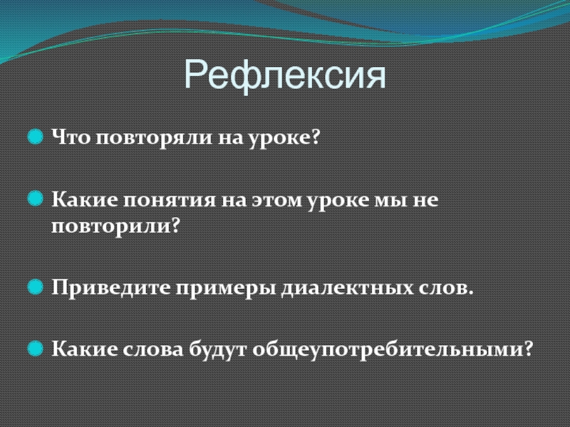 Рефлексия Что повторяли на уроке?Какие понятия на этом уроке мы не повторили? Приведите примеры диалектных слов.Какие слова
