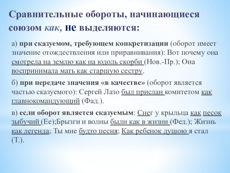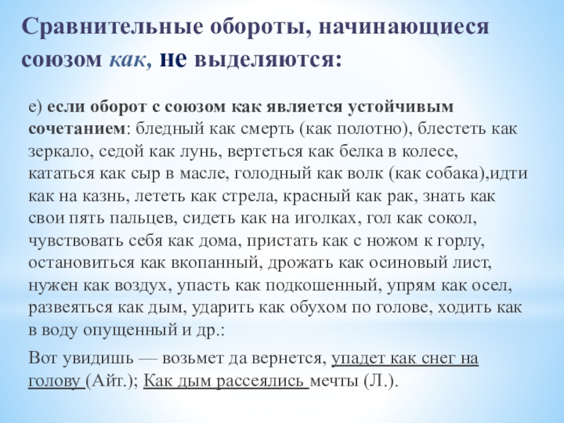 в) если оборот является сказуемым: Снег у крыльца как песок зыбучий (Ее);Брызги и волны были как в жизни (Фед.); Жизнь как легенда; Ты мне будто песня; Как ребенок душою я стал (Т.).
