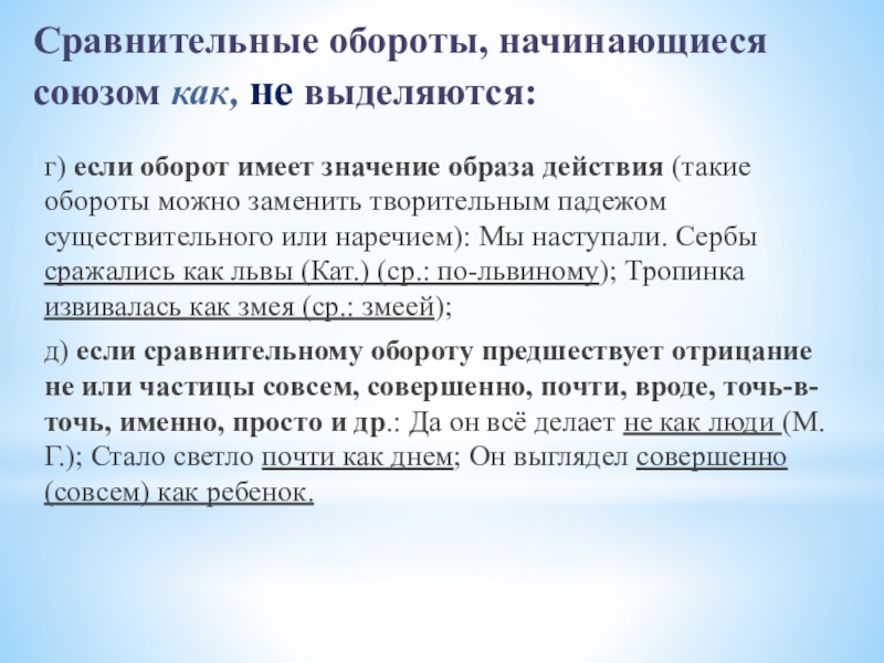 д) если сравнительному обороту предшествует отрицание не или частицы совсем, совершенно, почти, вроде, точь-в-точь, именно, просто и др.: Да он всё делает не как люди (М. Г.); Стало светло почти как днем; Он выглядел совершенно (совсем) как ребенок.