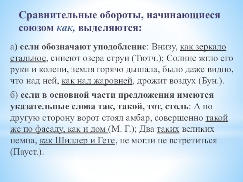 б) если в основной части предложения имеются указательные слова так, такой, тот, столь: А по другую сторону ворот стоял амбар, совершенно такой же по фасаду, как и дом (М. Г.); Два таких великих немца, как Шиллер и Гете, не могли не встретиться (Пауст.).