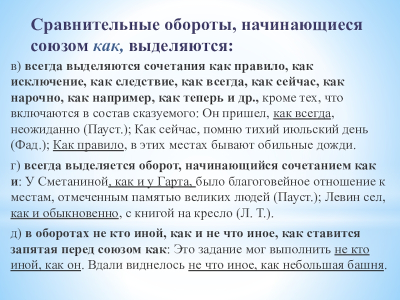 г) всегда выделяется оборот, начинающийся сочетанием как и: У Сметаниной, как и у Гарта, было благоговейное отношение к местам, отмеченным памятью великих людей (Пауст.); Левин сел, как и обыкновенно, с книгой на кресло (Л. Т.).