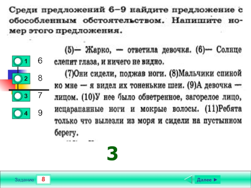 золотыми рыбками. Хлебных крошек, (4) конечно, (5) не было,(6) рыбкам сыпали кусочки казеинового клея,(7) меняли им воду или просто любовались через толстое зелёное стекло.