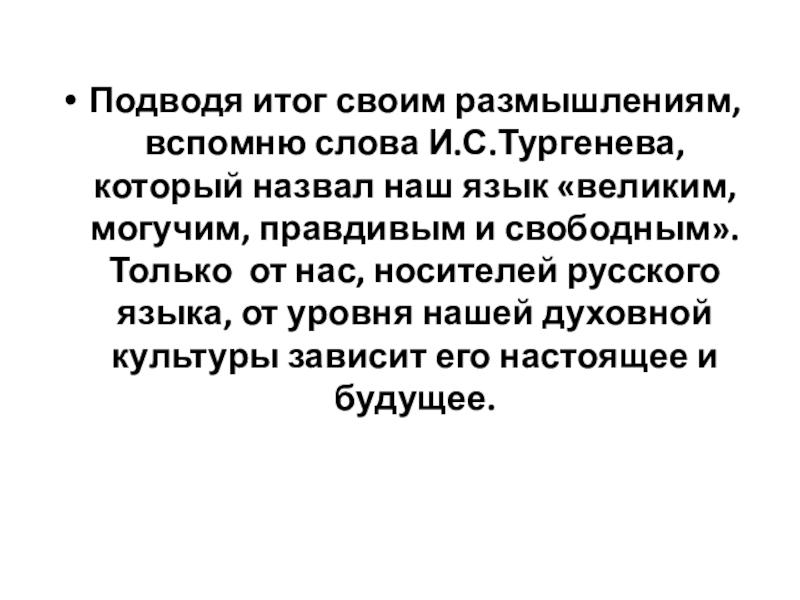 Подводя итог своим размышлениям, вспомню слова И.С.Тургенева, который назвал наш язык «великим, могучим, правдивым и свободным». Только от нас, носителей русского языка, от уровня нашей духовной культуры зависит его настоящее и будущее.