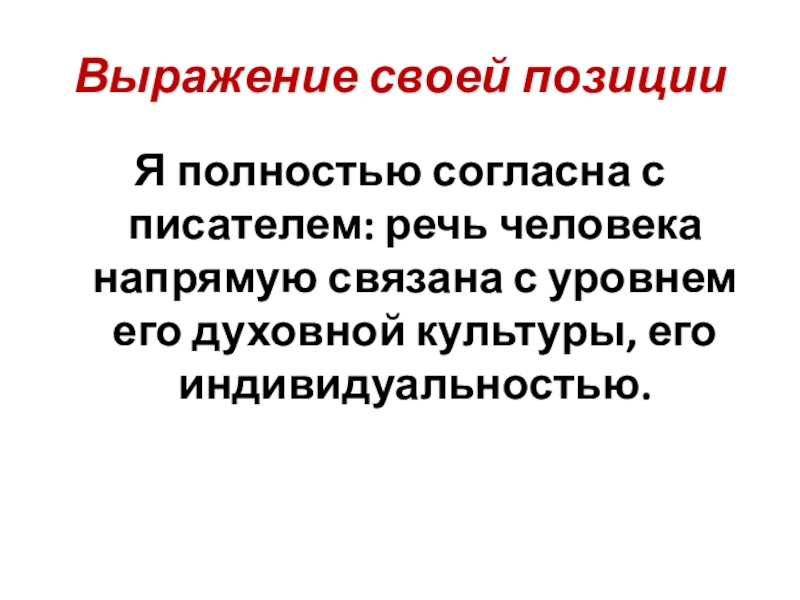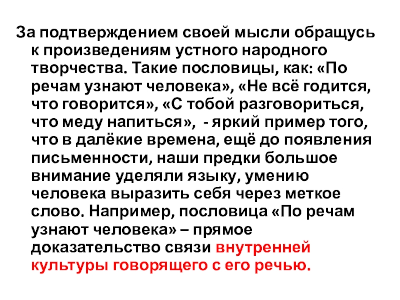 Я полностью согласна с писателем: речь человека напрямую связана с уровнем его духовной культуры, его индивидуальностью. За подтверждением своей мысли обращусь к произведениям устного народного творчества. Такие пословицы, как: «По речам узнают человека», «Не всё годится, что говорится», «С тобой разговориться, что меду напиться», - яркий пример того, что в далёкие времена, ещё до появления письменности, наши предки большое внимание уделяли языку, умению человека выразить себя через меткое слово. Например, пословица «По речам узнают человека» – прямое доказательство связи внутренней культуры говорящего с его речью.