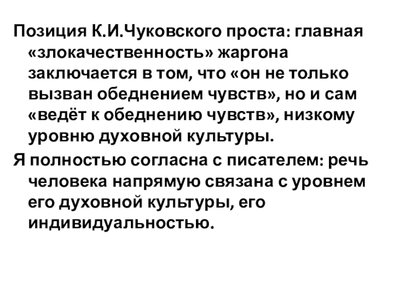 Позиция К.И.Чуковского проста: главная «злокачественность» жаргона заключается в том, что «он не только вызван обеднением чувств», но и сам «ведёт к обеднению чувств», низкому уровню духовной культуры.