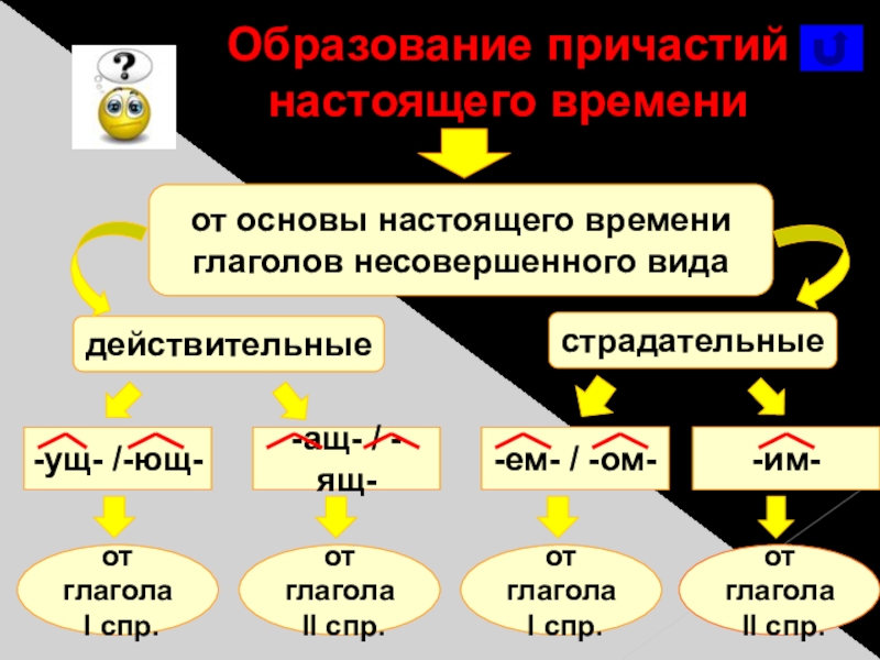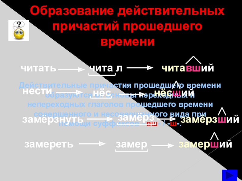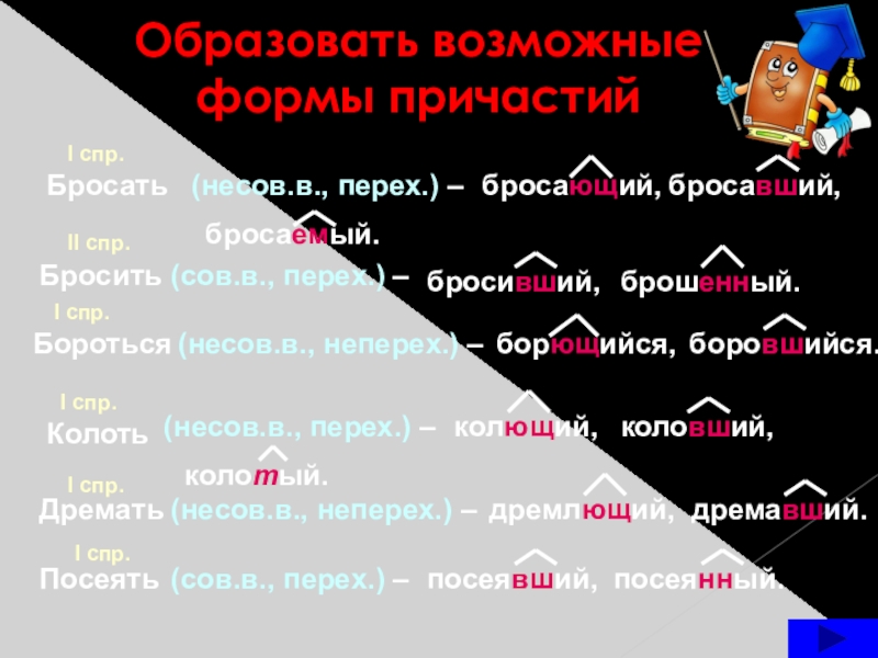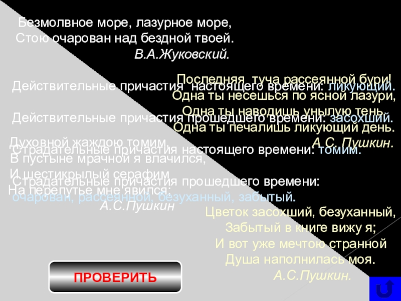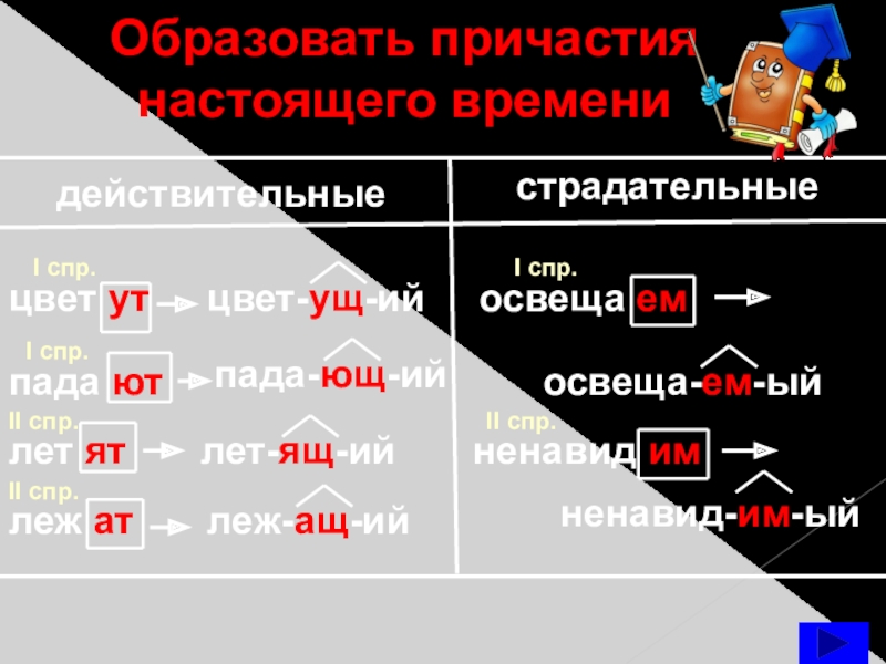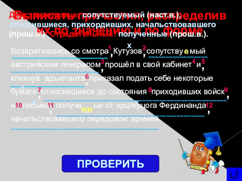 Действительные: сопутствуемый (наст.в.), относившиеся, прихордивших, начальствовавшего (прош.в.). Страдательные: полученные (прош.в.).