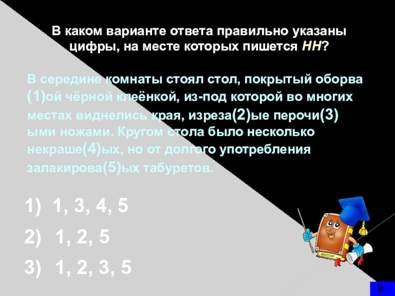 В середине комнаты стоял стол, покрытый оборва(1)ой чёрной клеёнкой, из-под которой во многих местах виднелись края, изреза(2)ые перочи(3)ыми ножами. Кругом стола было несколько некраше(4)ых, но от долгого употребления залакирова(5)ых табуретов.