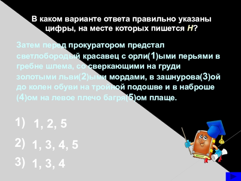 Затем перед прокуратором предстал светлобородый красавец с орли(1)ыми перьями в гребне шлема, со сверкающими на груди золотыми льви(2)ыми мордами, в зашнурова(3)ой до колен обуви на тройной подошве и в наброше(4)ом на левое плечо багря(5)ом плаще.